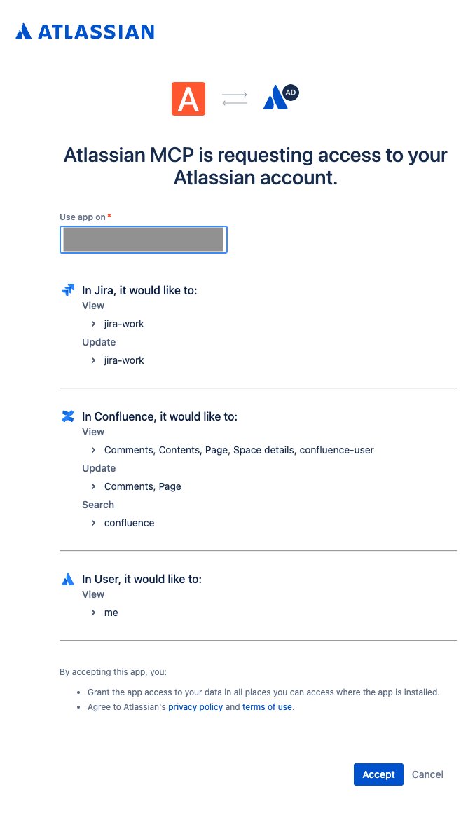 You will get a request from the Atlassian MCP to access to your Atlassian account. - Select a specific instance, and then choose Accept.