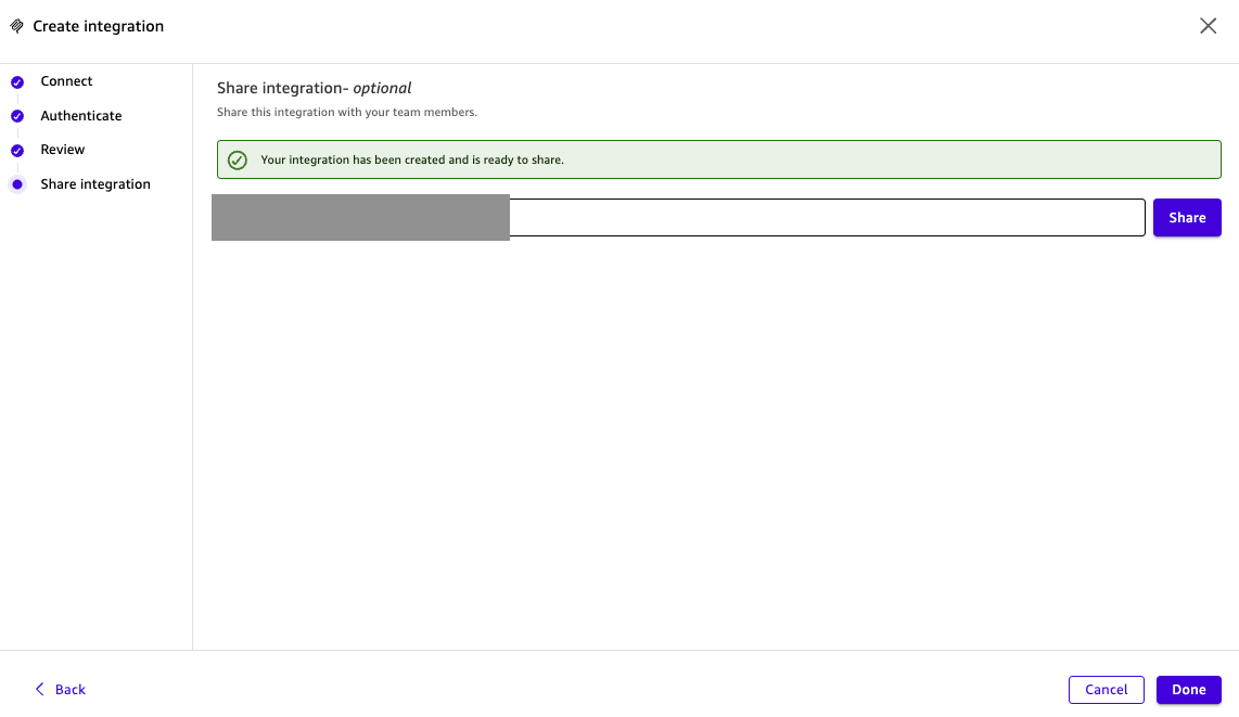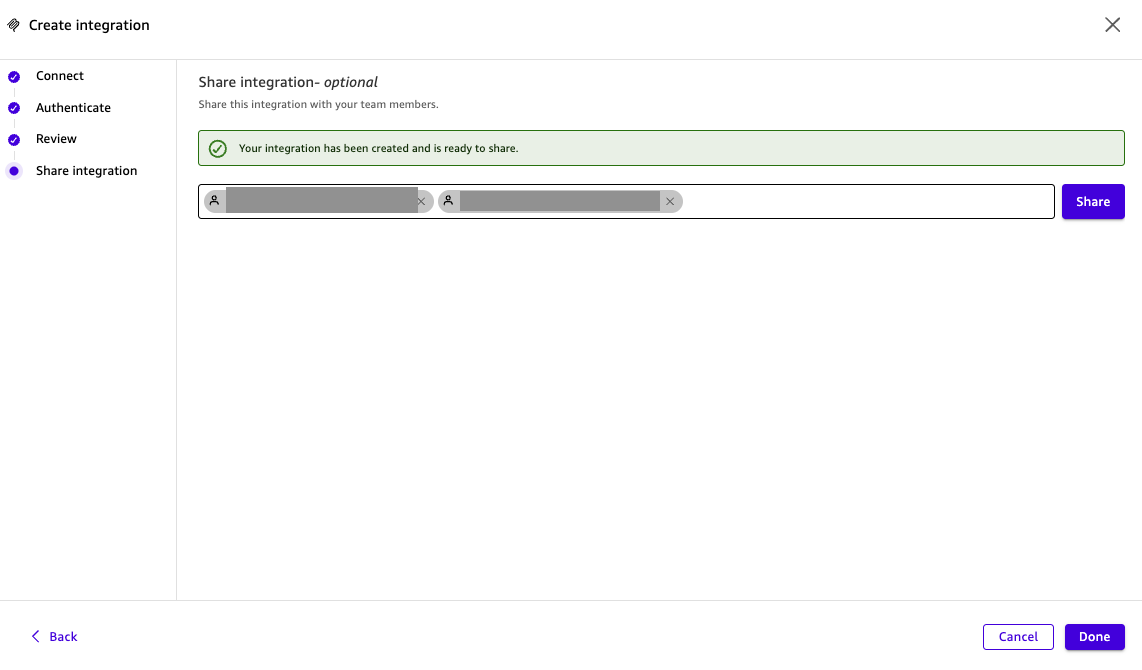 - Optionally, you can share the integration with other users and groups. Because Atlassian MCP server supports 3LO, the users with whom you share the connection will only be able to invoke the actions, retrieve the content, and take the actions that they are authorized to access on Atlassian Confluence and Jira. Select Done.