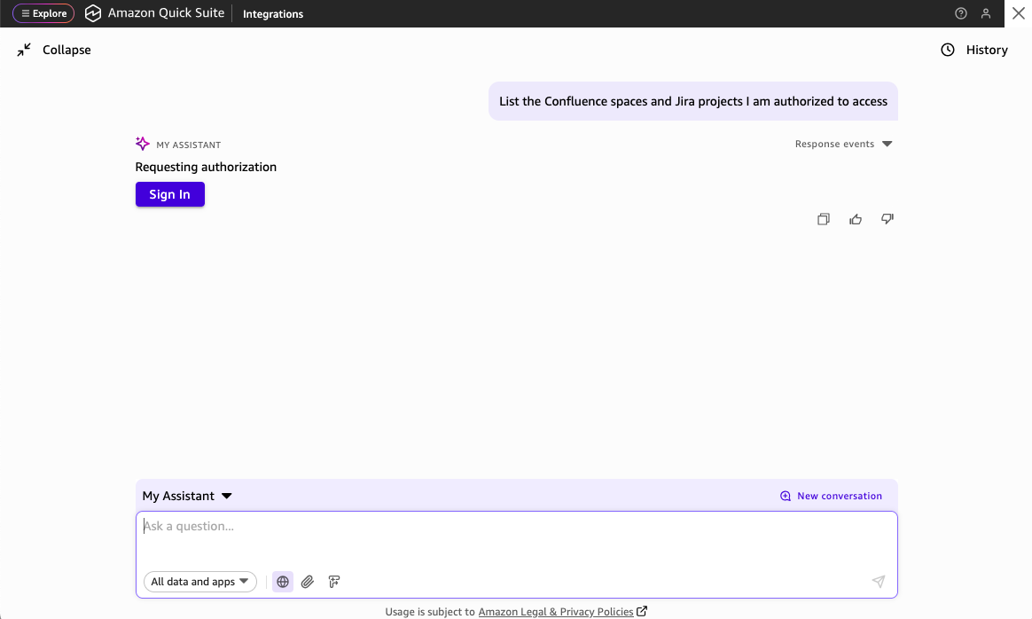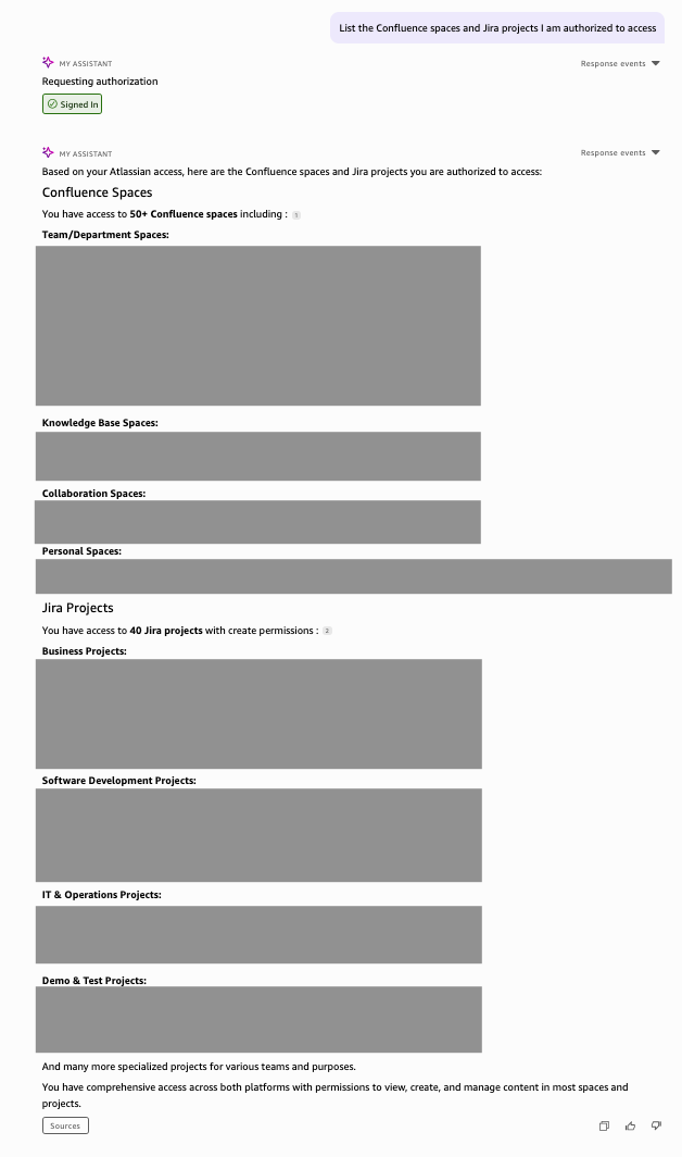 Actions integration from an Amazon Quick Suite Chat Agent, such as My Assistant, using a simple prompt such asList the Confluence spaces and Jira projects I am authorized to access.