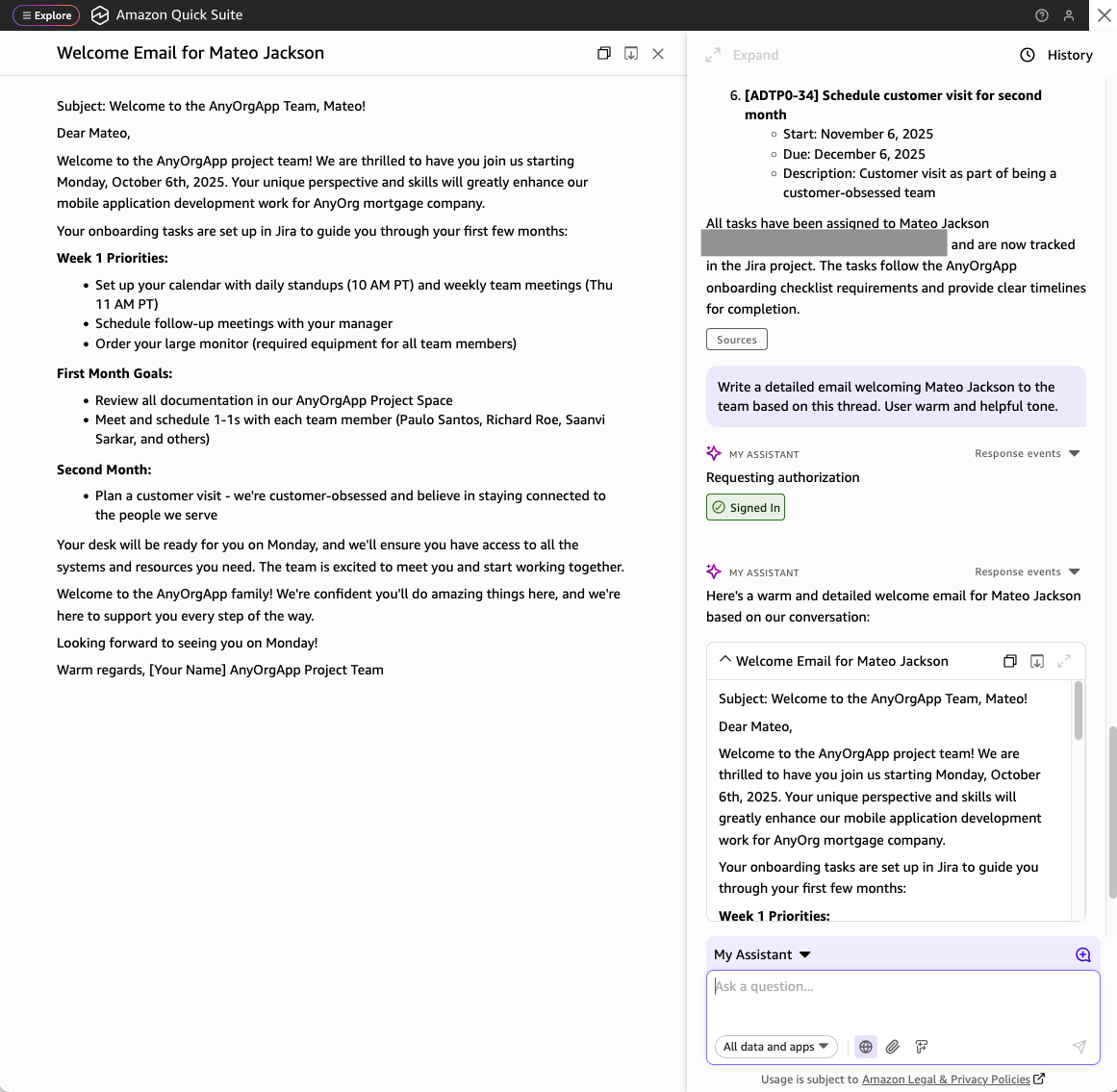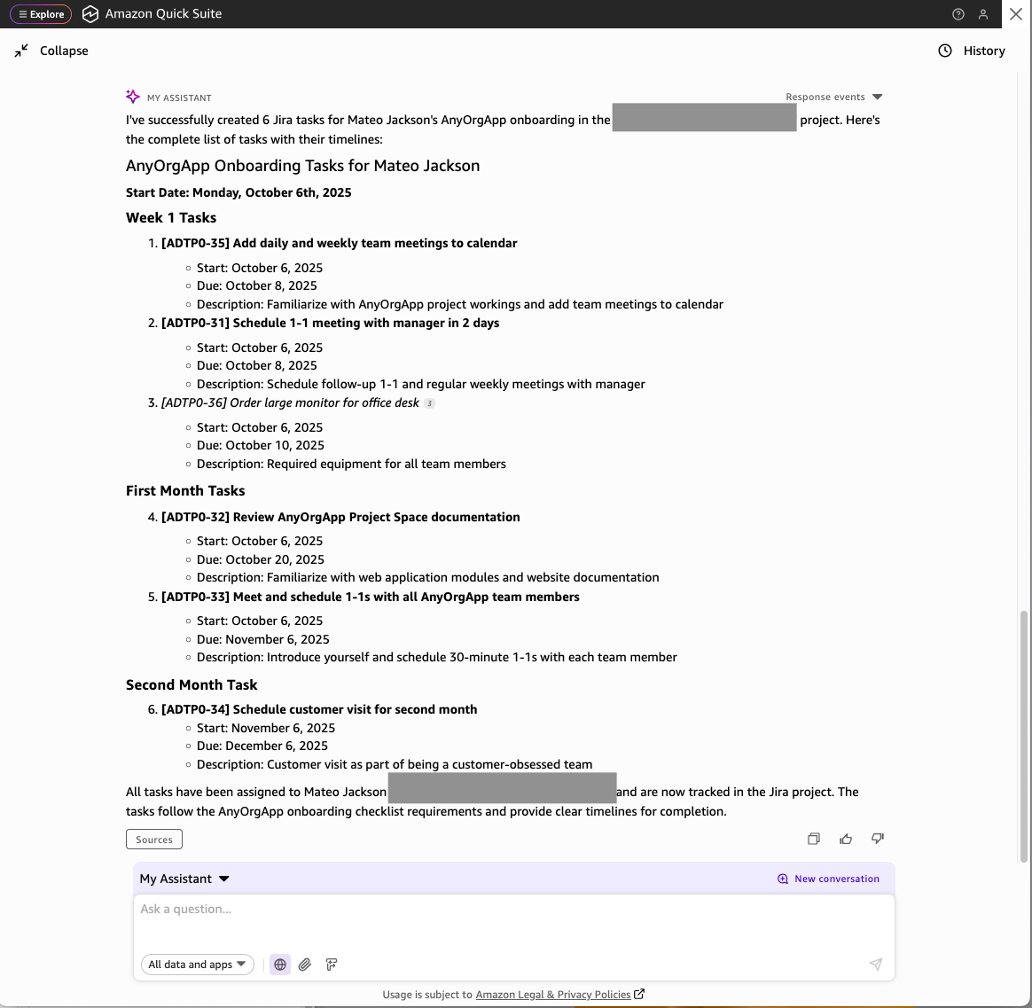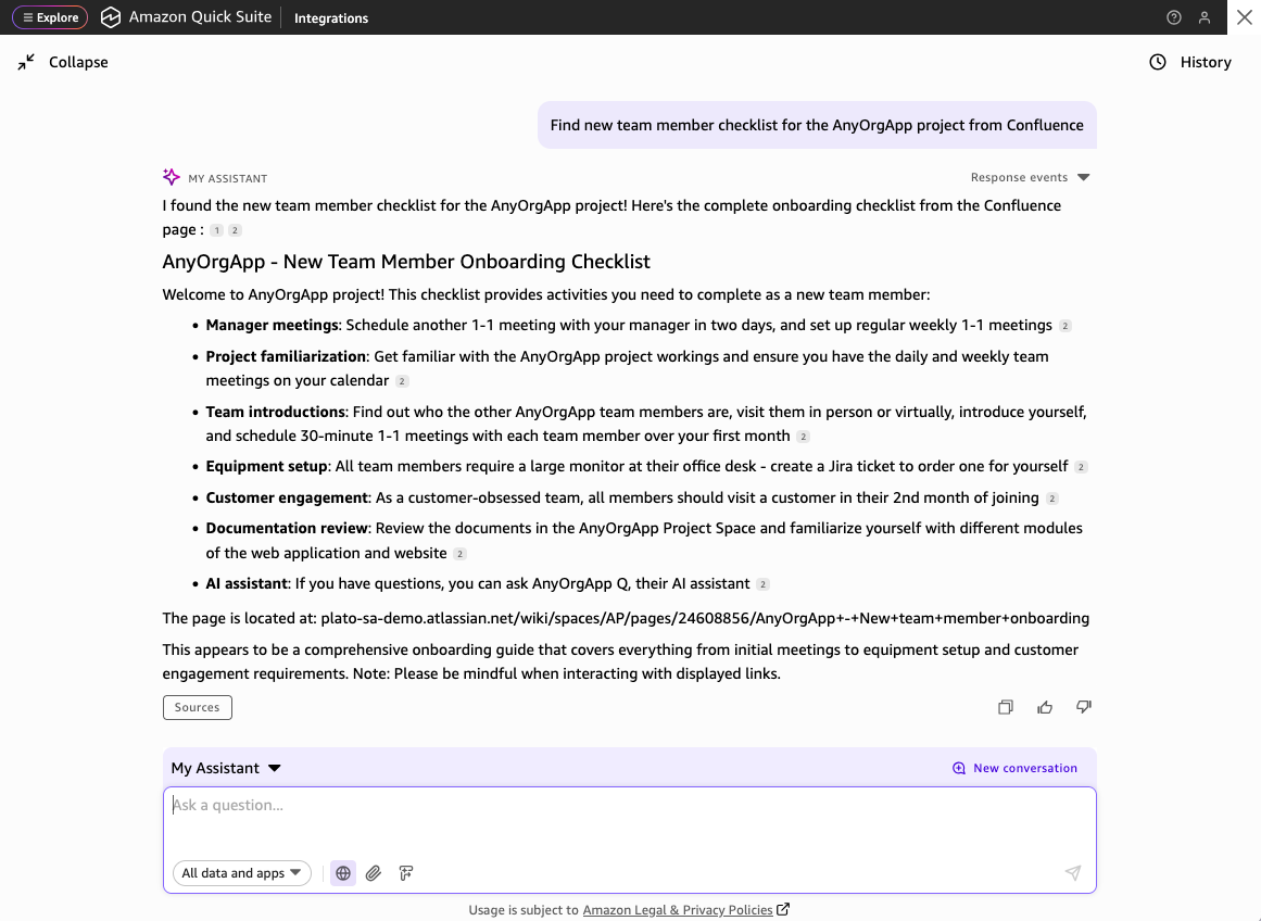 To illustrate the Atlassian MCP server Actions integration, let’s take the use case of a team manager at a fictitious company, AnyOrgApp Corp, who is preparing to welcome a new employee to the team with help from the Amazon Quick Suite default Chat Agent, My Assistant. The Atlassian instance used for this illustration has a Confluence space with the content about AnyOrgApp Corp and a Jira project for this team. Based on the contents of your Confluence spaces and Jira projects, you can also experiment with similar use cases.