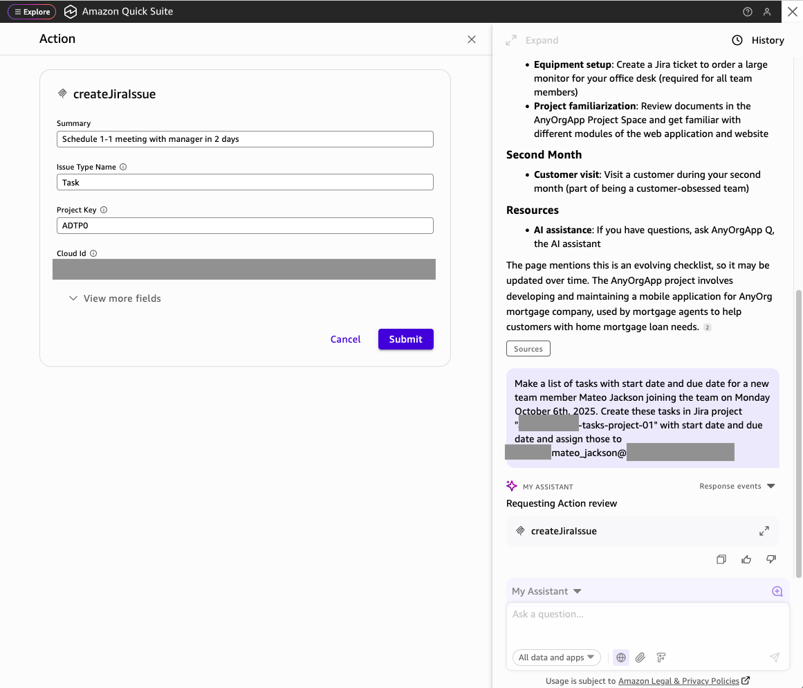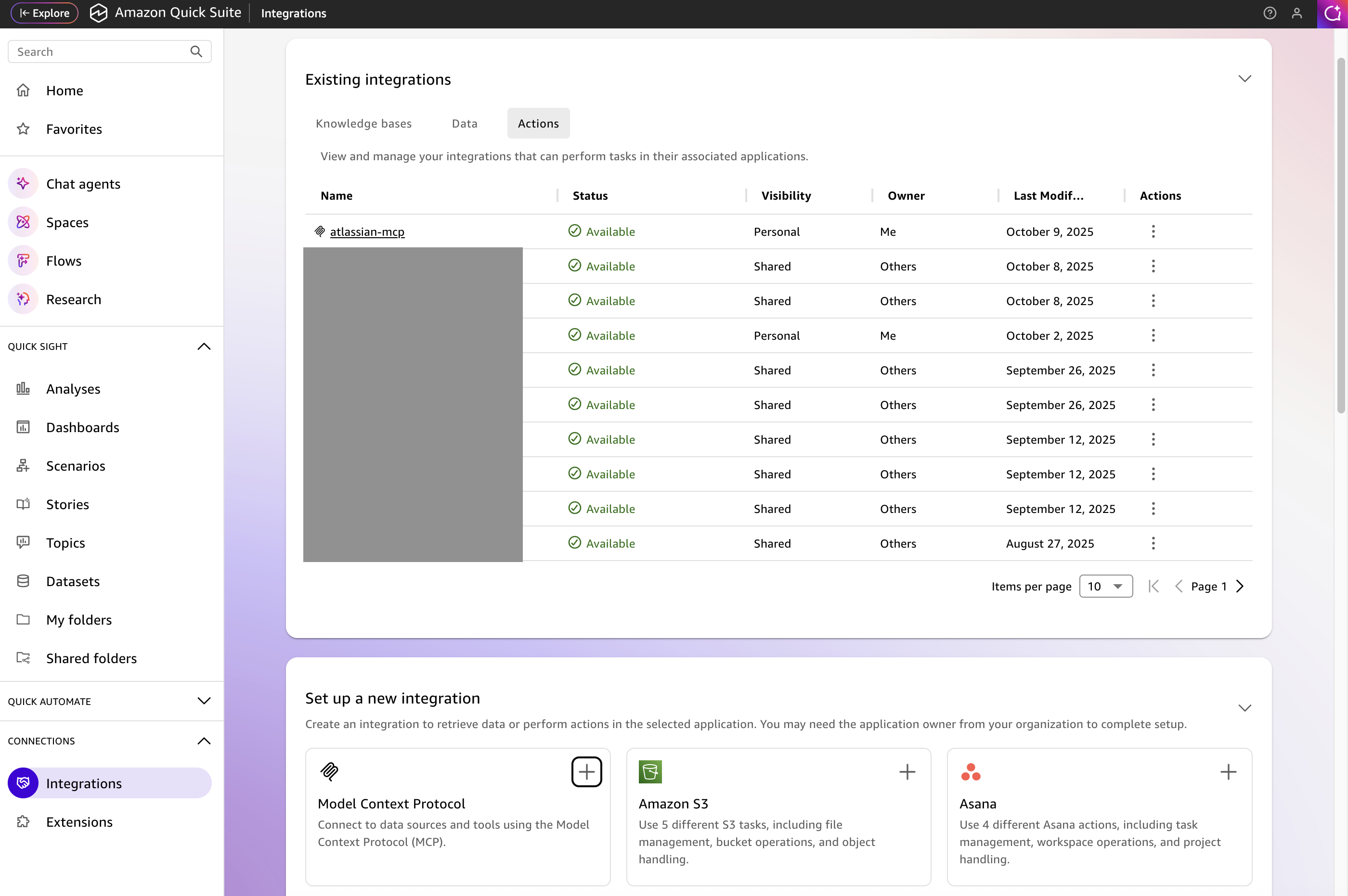 In this section, you will create an Amazon Quick Suite Actions integration with the Atlassian MCP server to connect with your Atlassian cloud instance, and then you will use your Amazon Quick Suite Chat Agent to invoke actions defined by this integration.