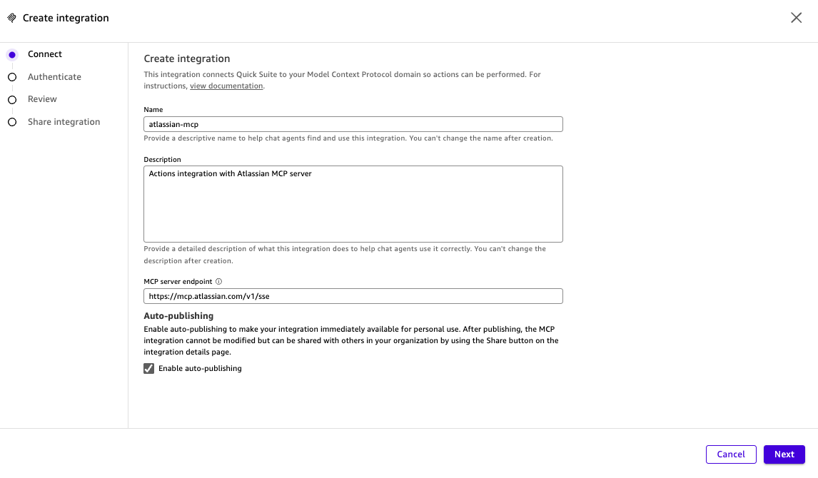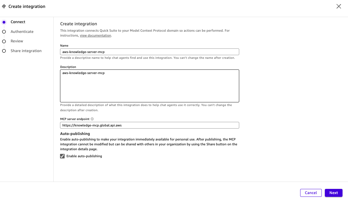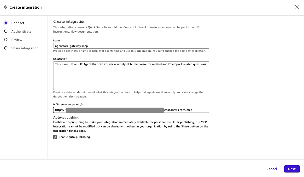 - As with earlier steps, set up a new MCP integration by entering a a Name, Description, and the Gateway resource URL of your Amazon AgentCore gateway (noted earlier as the MCP server endpoint). Choose Next. The Description includes details of the features the Actions integration provides. Amazon Quick Suite uses this description to decide the Actions to be invoked for a user prompt.