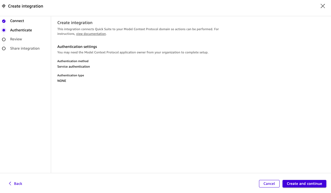 - This MCP server does not require authentication, so the MCP Client has the information needed to create the integration. Choose Create and continue.