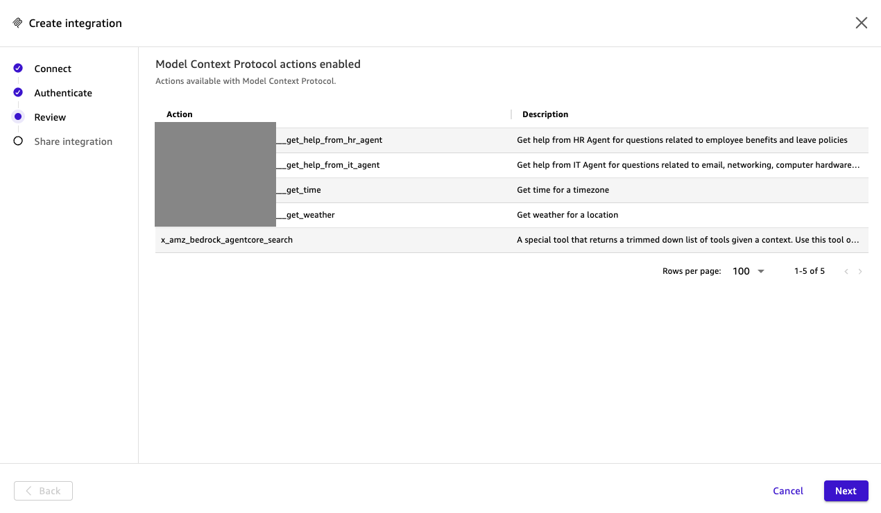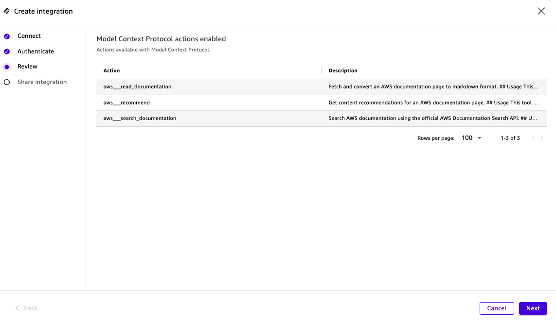 - When the actions made available to you by AWS Knowledge Server appear, choose Next, to complete the Actions integration creation.