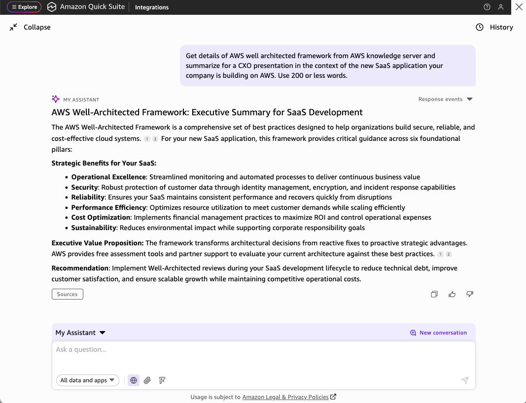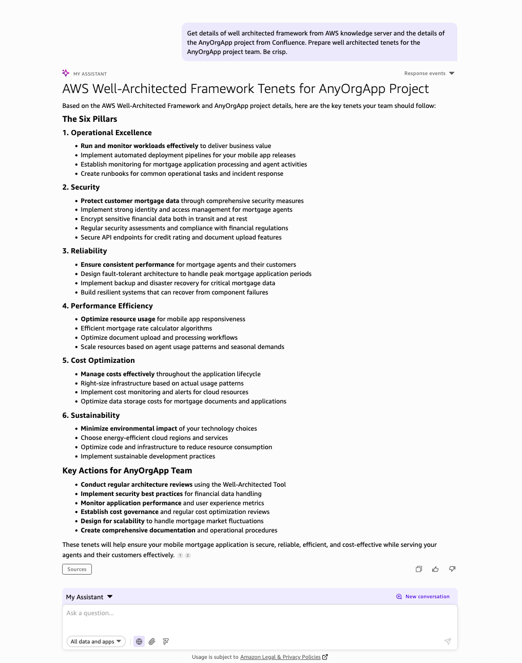 - After the aws-knowledge-server-mcp Actions integration status is available, use the default Chat Agent, My Assistant, to start asking information about AWS. You can use prompts such as this one:.