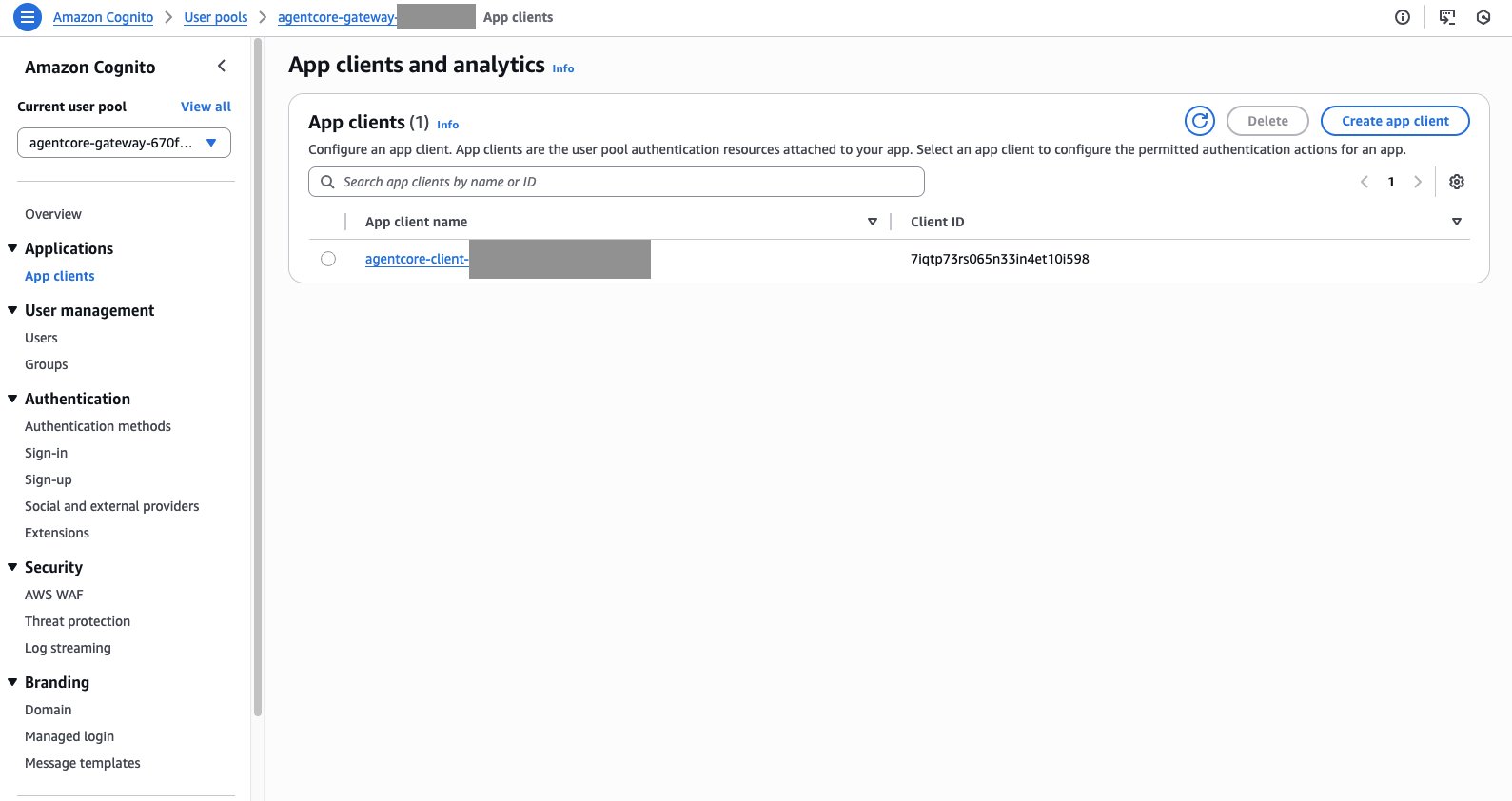 - Create an Amazon Bedrock AgentCore Gateway instance with an Amazon Cognito authorizer and a default AWS Lambda target using Quick Start with creating and using a gateway.