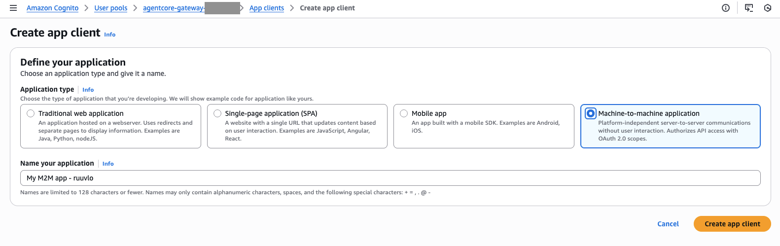 - Create a new App client for use with the Amazon Quick Suite MCP client. Choose Create app client, then select Machine-to-machine application, and then choose Create app client.