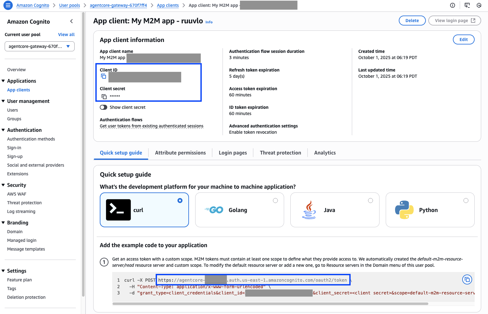 - For the new App client you just created, note the Client ID, the Client secret, and the token URL. You will need these parameters in subsequent steps.