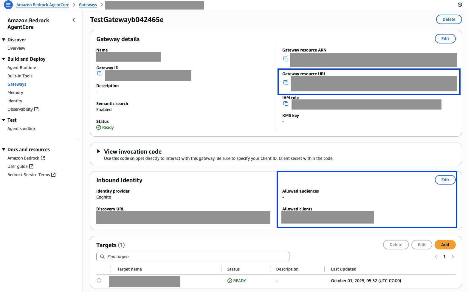 - Open Amazon Bedrock AgentCore in the AWS Management Console on a new tab in your browser. Select Gateways in the left navigation panel, and then select the gateway you just created. Note the Gateway resource URL.