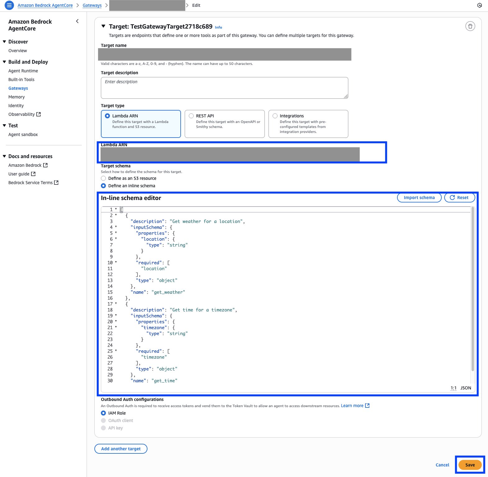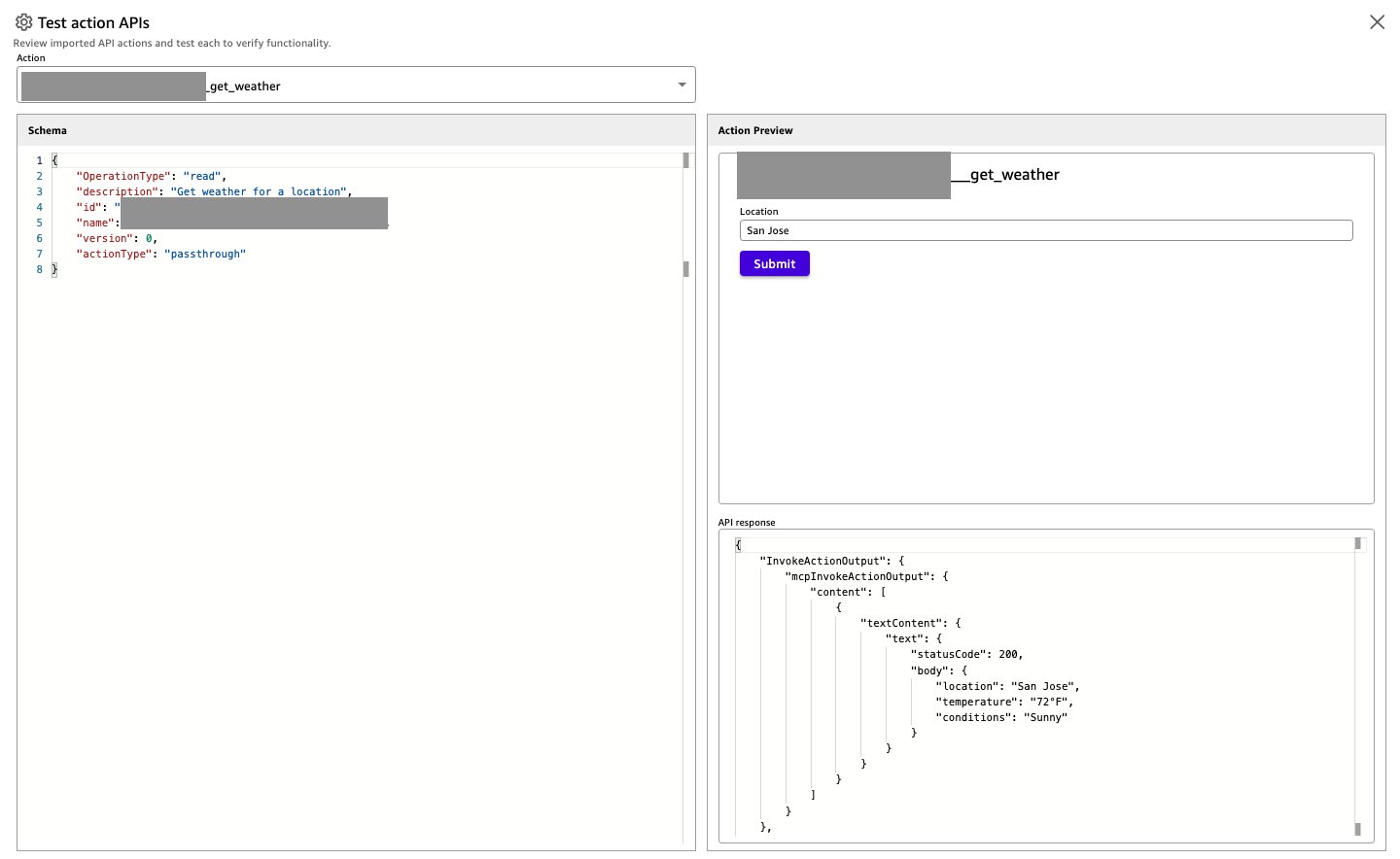 - Review the Actions made available as MCP tools by the Amazon Bedrock AgentCore Gateway.