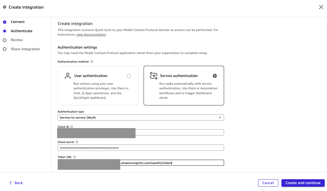 - Select Service authentication in Authentication settings or 2LO authentication. The users with whom this Actions integration is shared will use these credentials as the inbound credentials for Amazon Bedrock AgentCore Gateway. You can create 3LO authentication using identity providers such as Okta or Entra ID. Enter the Client ID, Client secret and Token URL of the Amazon Cognito user pool App client you created earlier. Choose Create and continue.