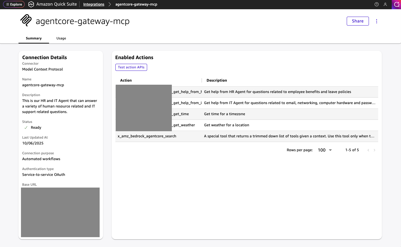- You can now test the Amazon Quick Suite Actions integration by opening the newly created integration and choosing Test action APIs.