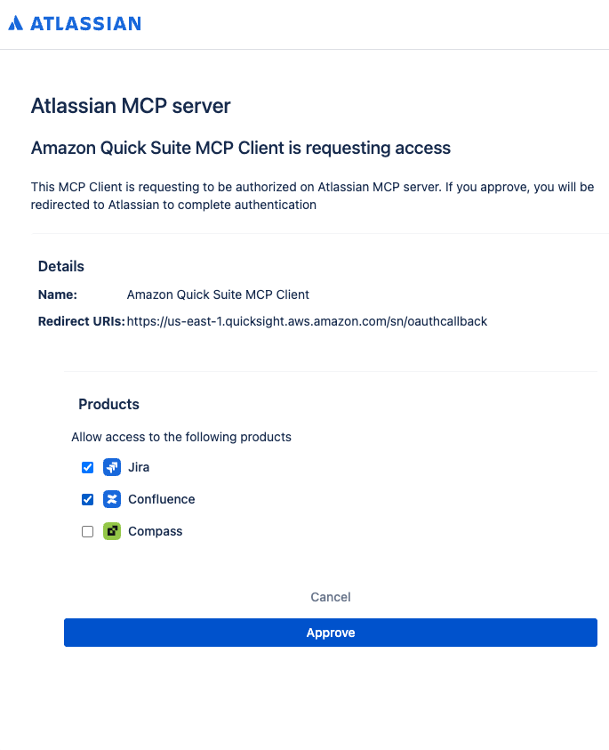 - In the pop-up window from Atlassian MCP server with a request to approve authorization for the Amazon Quick Suite MCP client. Choose Approve.