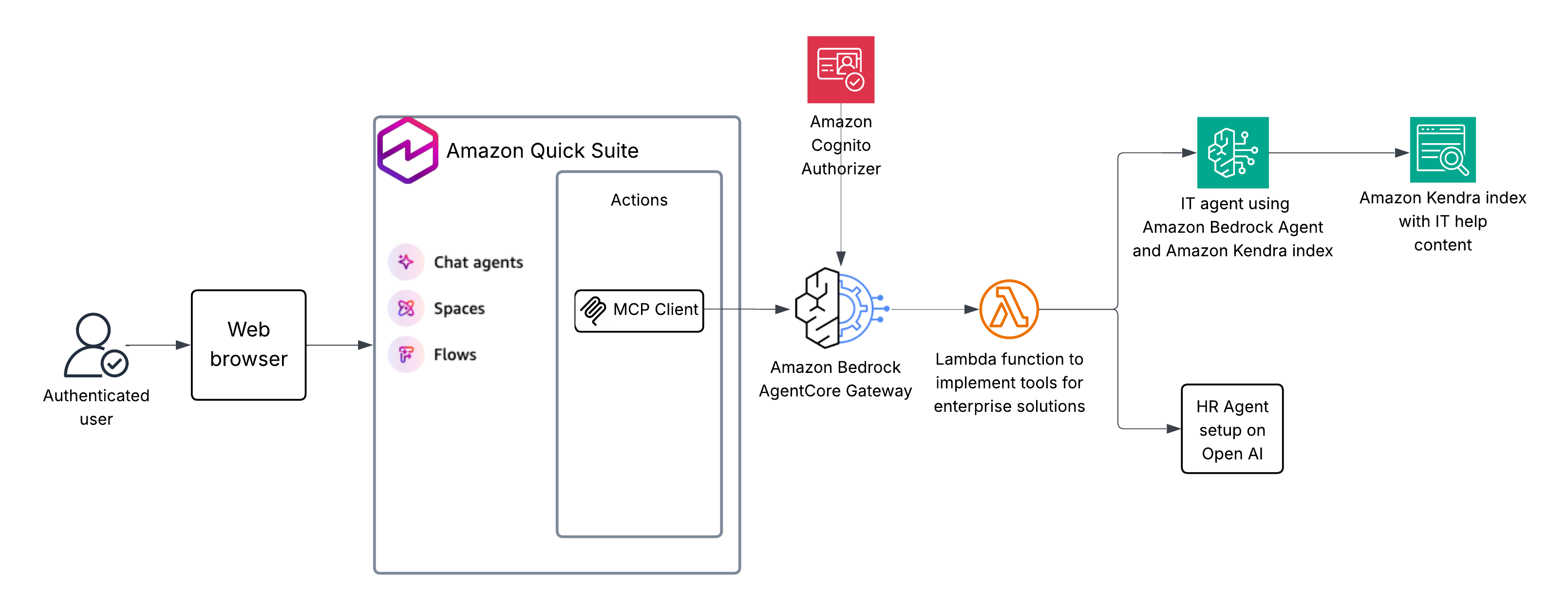 Let’s take an example (shown in the following diagram) where we need to connect to an IT agent implemented using Amazon Bedrock Agent with an Amazon Kendra index that has IT help content, and an HR agent setup on OpenAI needs to be made available to Amazon Quick Suite users.
