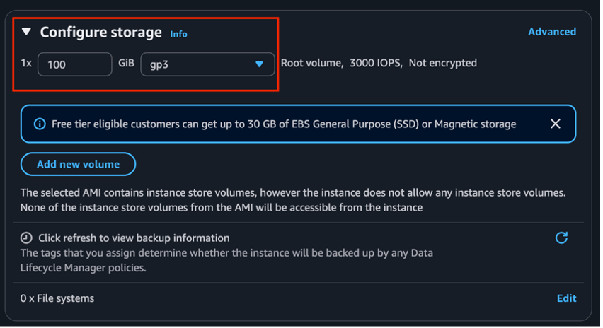 - Allocate at least 100 GiB for storage.