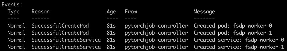 The output should show both FSDP worker pods as Running: