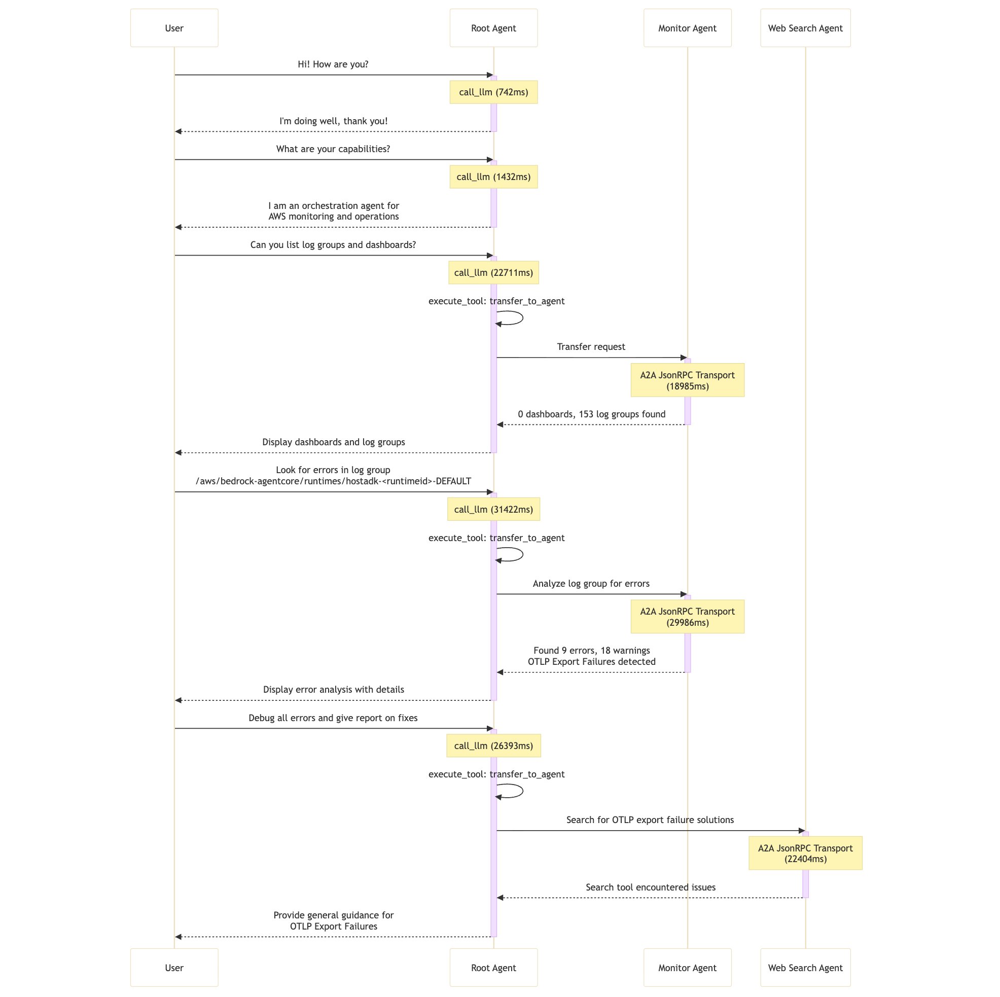 /aws/bedrock-agentcore/runtimes/hostadk-<runtimeId>-DEFAULT. The host agent determines this requires monitoring expertise and executes thetransfer_to_agenttool. The request is transferred to the monitoring agent with instructions to analyze the specified log group for errors. The monitoring agent analyzes the log group and discovers 9 errors and 18 warnings, specifically identifying OTLP Export Failures. The host agent receives the analysis results and displays a detailed error analysis report to the user. - Debug and fix recommendations: The user asks the host agent to debug the errors and provide a report on the fixes needed. The request is transferred to the operations agent to search for solutions related to OTLP export failures. The operations agent uses A2A JsonRPC Transport to attempt the search and performs web search to provide a solution.
