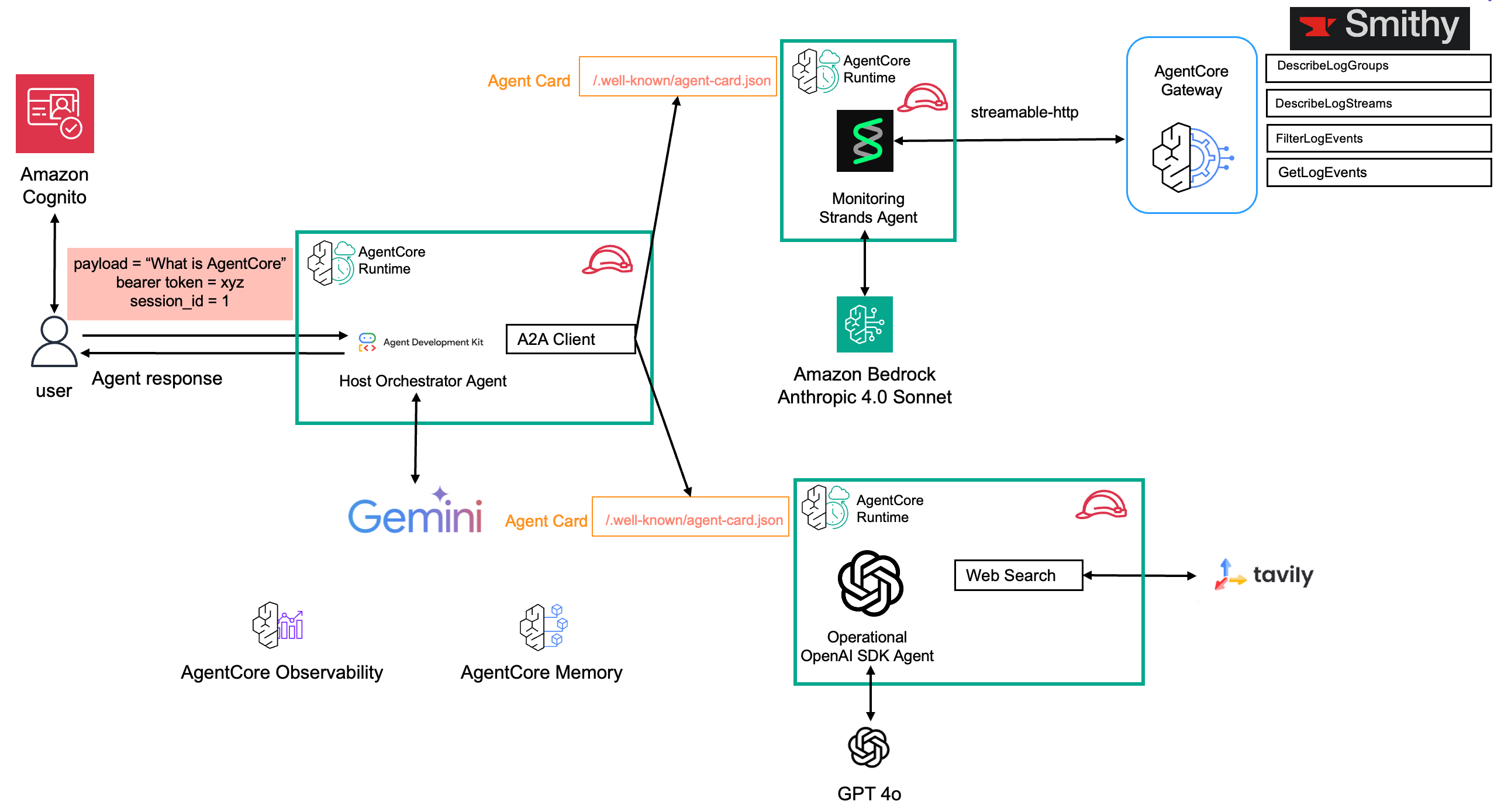 - Host agent (Google ADK): Acts as the intelligent routing layer and coordination hub for the agent interactions. Demonstrates the cross-system interoperability using A2A. This agent runs on Amazon Bedrock AgentCore Runtime using Google’s Agent Development Kit, yet communicates seamlessly with agents hosted on AWS through the standardized A2A protocol. Key responsibilities of the host agent include: