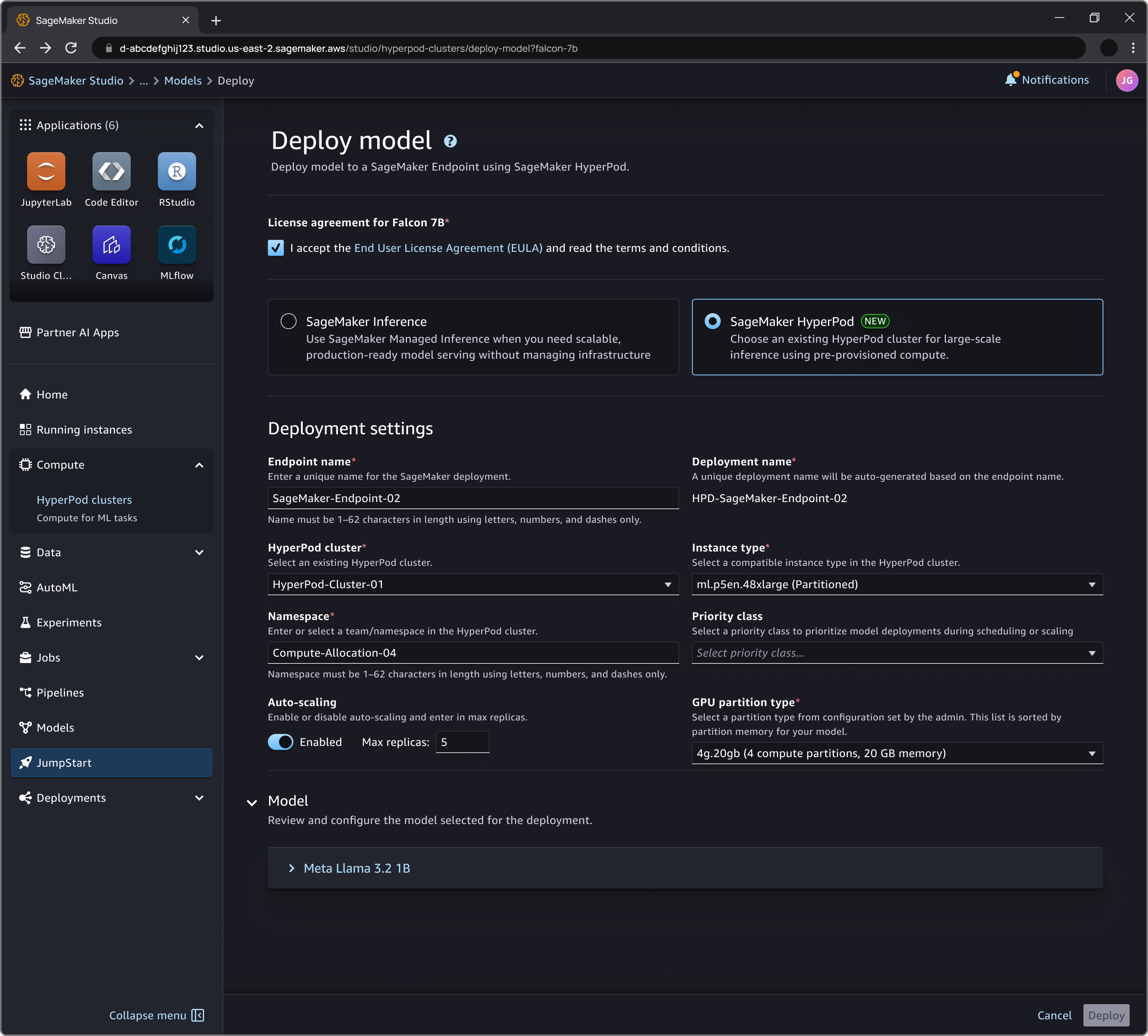 You can also deploy your JumpStart model directly from SageMaker AI Studio, as shown in the following screenshot: