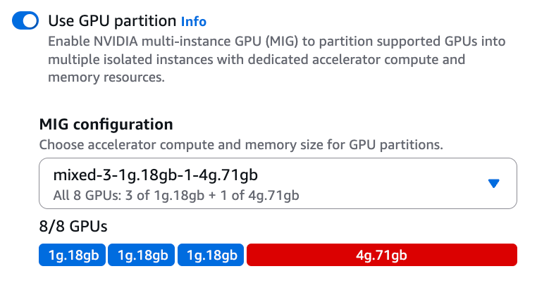 You can set up the rest of the cluster as you like. This post doesn’t cover the other segments of the cluster. For the rest of this post, unless otherwise stated, you may assume that we use a ml.p5en.48xlarge instance with the MIG configuration stated previously.
