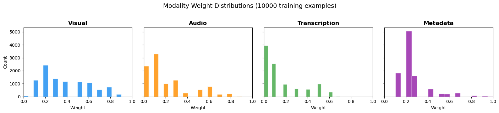 For this post, we prepared 10,000 synthetic labeled examples using Nova Premier, the largest and most capable model in the Nova family. The data was generated with a balanced distribution across visual, audio, transcription, and metadata signal queries, The examples cover the full range of expected search inputs, represent different difficulty levels, include edge cases and variations, and prevent overfitting to narrow query patterns. The following chart shows the weight distribution across the four modality channels.