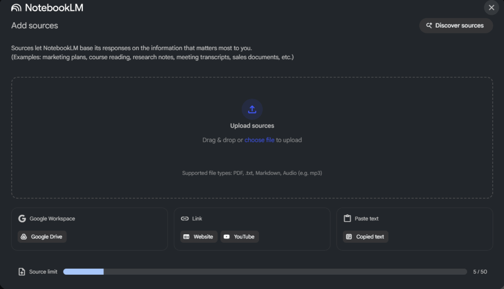 • Upload various file types including PDFs, Google Docs/Slides, Markdown, audio files, copied text, public web URLs, and YouTube videos (with transcripts/subtitles).